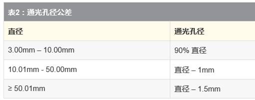 通光孔徑是指光學元件的直徑或必須滿足各種規(guī)格的光學元件的尺寸。除通光孔徑以外,制造商并不能確保光學產(chǎn)品符合指定的規(guī)格。由于生產(chǎn)的限制,實際上是不可能生產(chǎn)出完全等同于光學產(chǎn)品的直徑或長乘以寬的通光孔徑。表2顯示了透鏡的一般通光孔徑。
