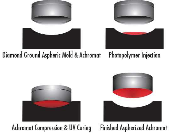 混合成型,以如消色差透鏡的一個標準球面表面為基底,通過包含了一薄層光敏聚合物的非球面模造,將該球面表面壓鑄成型,*終生產(chǎn)出一個非球面表面。這項技術采用一個鉆石磨砂非球面模造和一個玻璃消色差透鏡(雖然也可以使用其他類型的單片透鏡和雙合透鏡),在非球面模造內(nèi)注入光敏聚合物,再讓非球面模造將球面表面壓鑄成型。*后,此技術通過在室溫壓縮和UV固化這兩個表面,產(chǎn)生一個非球面消色差透鏡。該透鏡的光學屬性結合了其所組成部件分別所展示的光學屬性:消色和球面像差校正。圖7為混合透鏡的制作過程?;旌铣尚头浅_m用于高批量高精密的應用,這些場合除了需要極高性能之外,也可以通過批量生產(chǎn)所獲得的成本節(jié)約抵消其高初始工具成本。更多有關使用混合流程制作非球面消色差透鏡的信息,請參閱為什么使用消色差透鏡?。