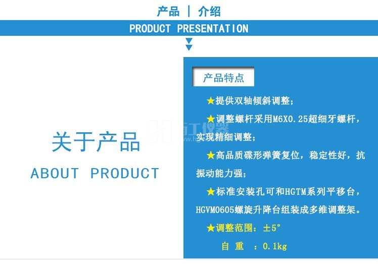 本產(chǎn)品提供雙軸傾斜調(diào)整,調(diào)整螺桿采用M6*0.25超細(xì)牙螺桿實現(xiàn)精細(xì)調(diào)整;高品質(zhì)蝶形彈簧復(fù)位,穩(wěn)定性好,抗振動能力強;標(biāo)準(zhǔn)安裝孔可和HGTM系列平移臺HGVM0605螺旋升降臺組成多維調(diào)整架。